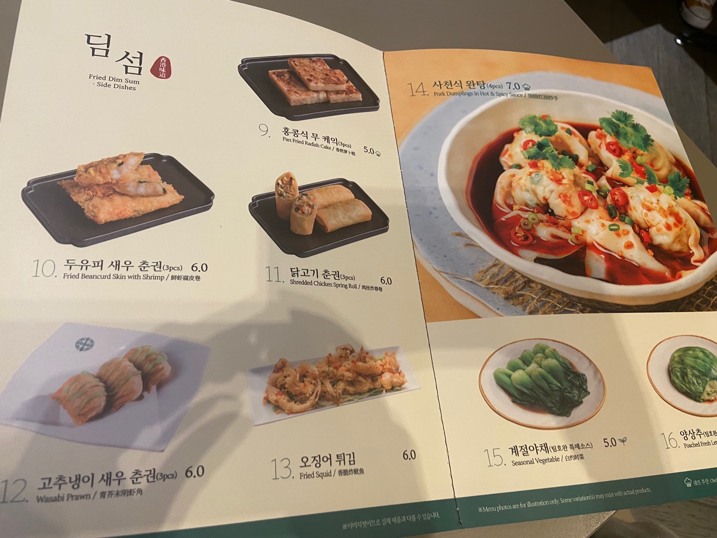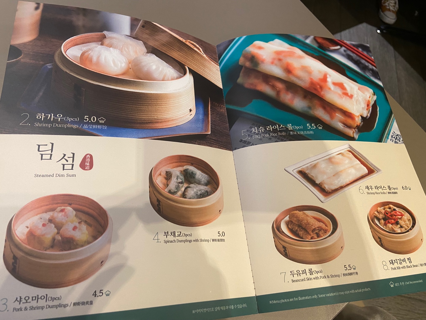 저는 샤오마이, 하가우, 차슈 볶음밥, 홍콩식 완탕면, 사천식 완탕, 계절야채, 차슈바오 빈 이렇게 7개 메뉴를 시켰습니다.