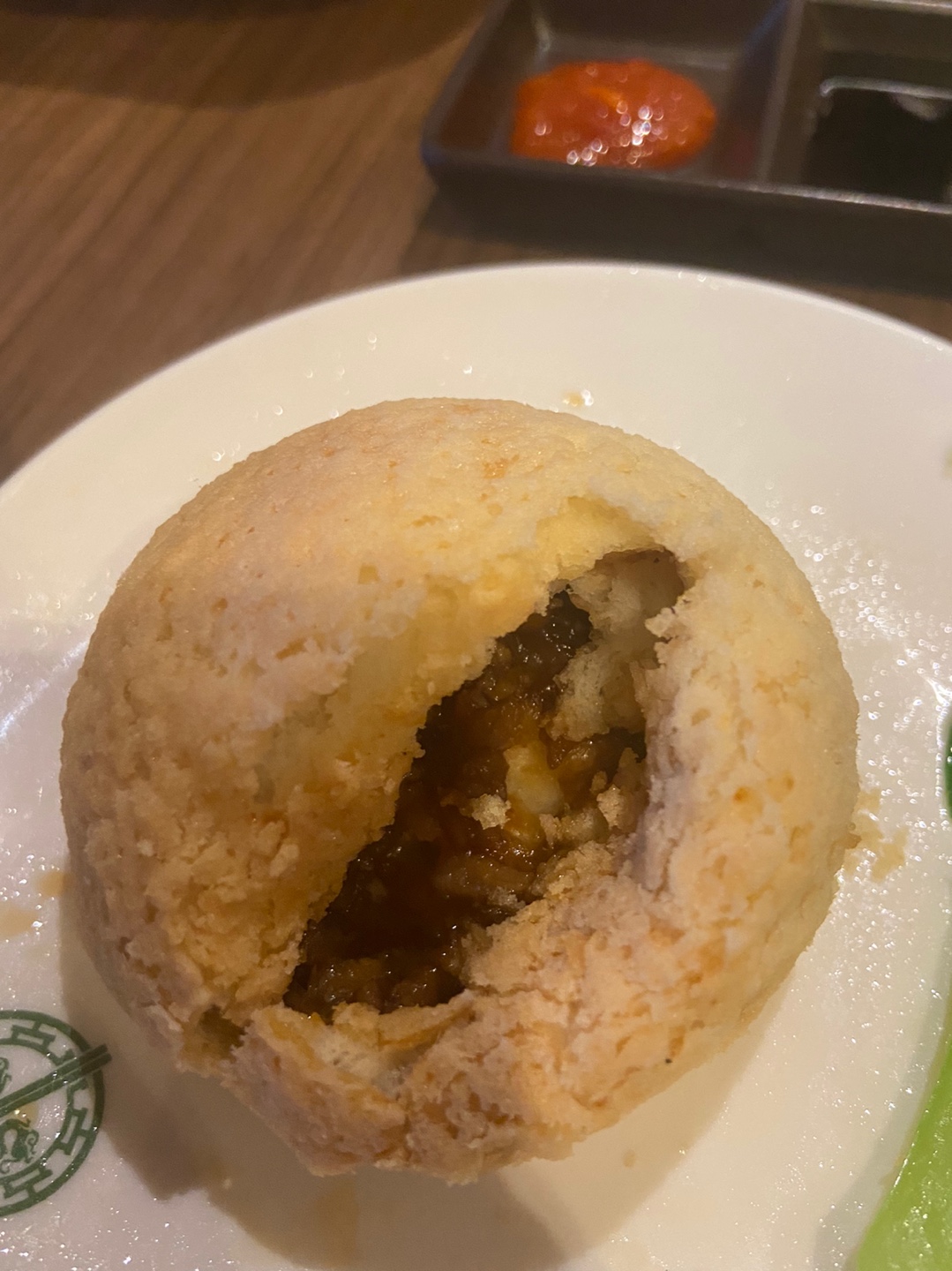 약간 커피 번빵에 안에는 만두처럼 팥 같은 달달한 소스에, 고기 속이 섞여있었습니다. 뭐라 표현하기 어렵네요.