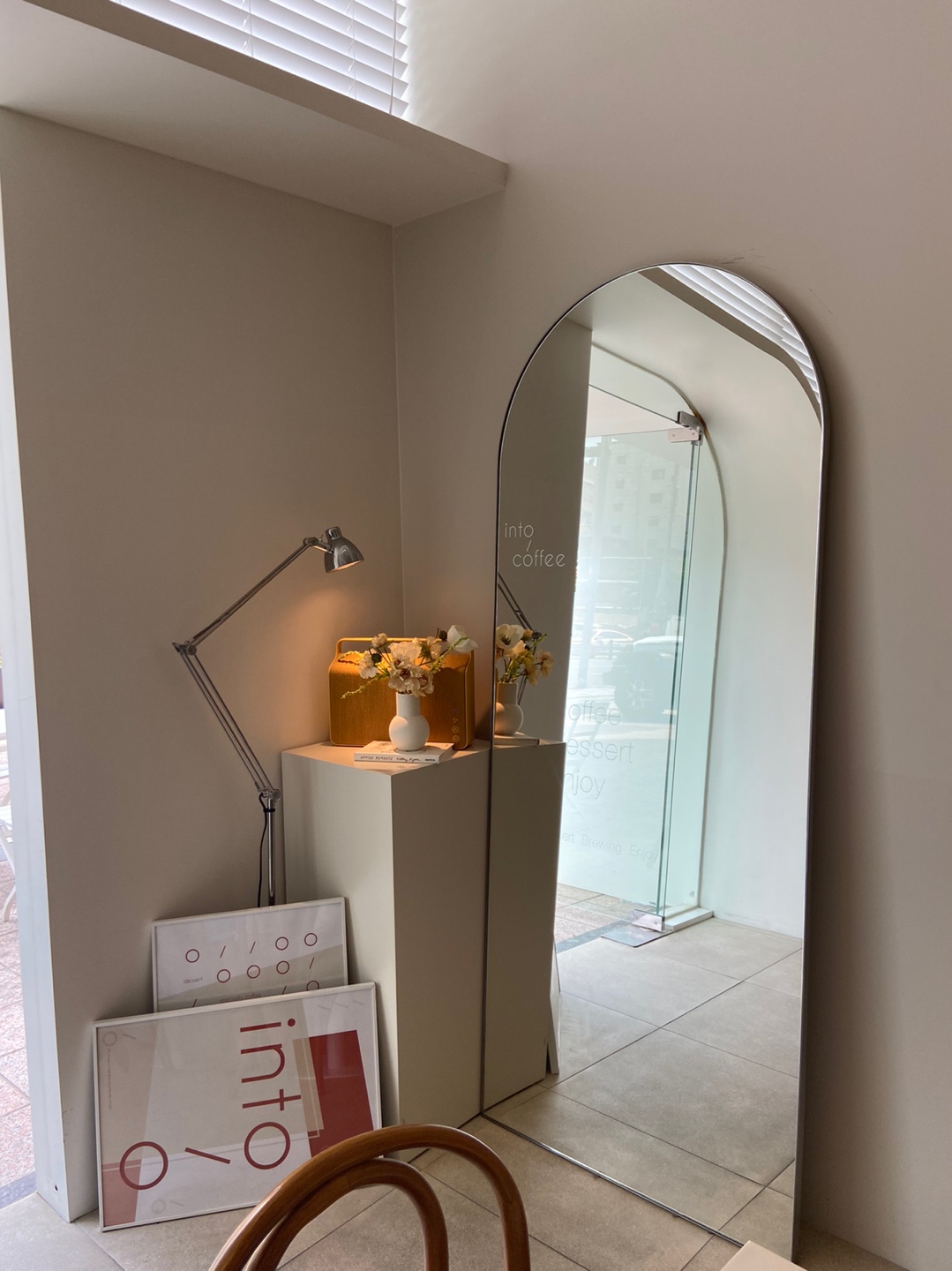 입구 쪽에 큰 거울이 있는데, 이것도 모던하면서 카페와 잘 어울렸습니다.