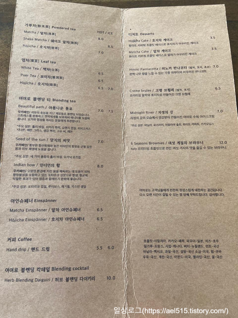 아름다운 통로(7,500원) , 핸드드립(6,000원) 그리고 시그니처 디저트 메뉴 여섯 계절의 브라우니(12,000원)