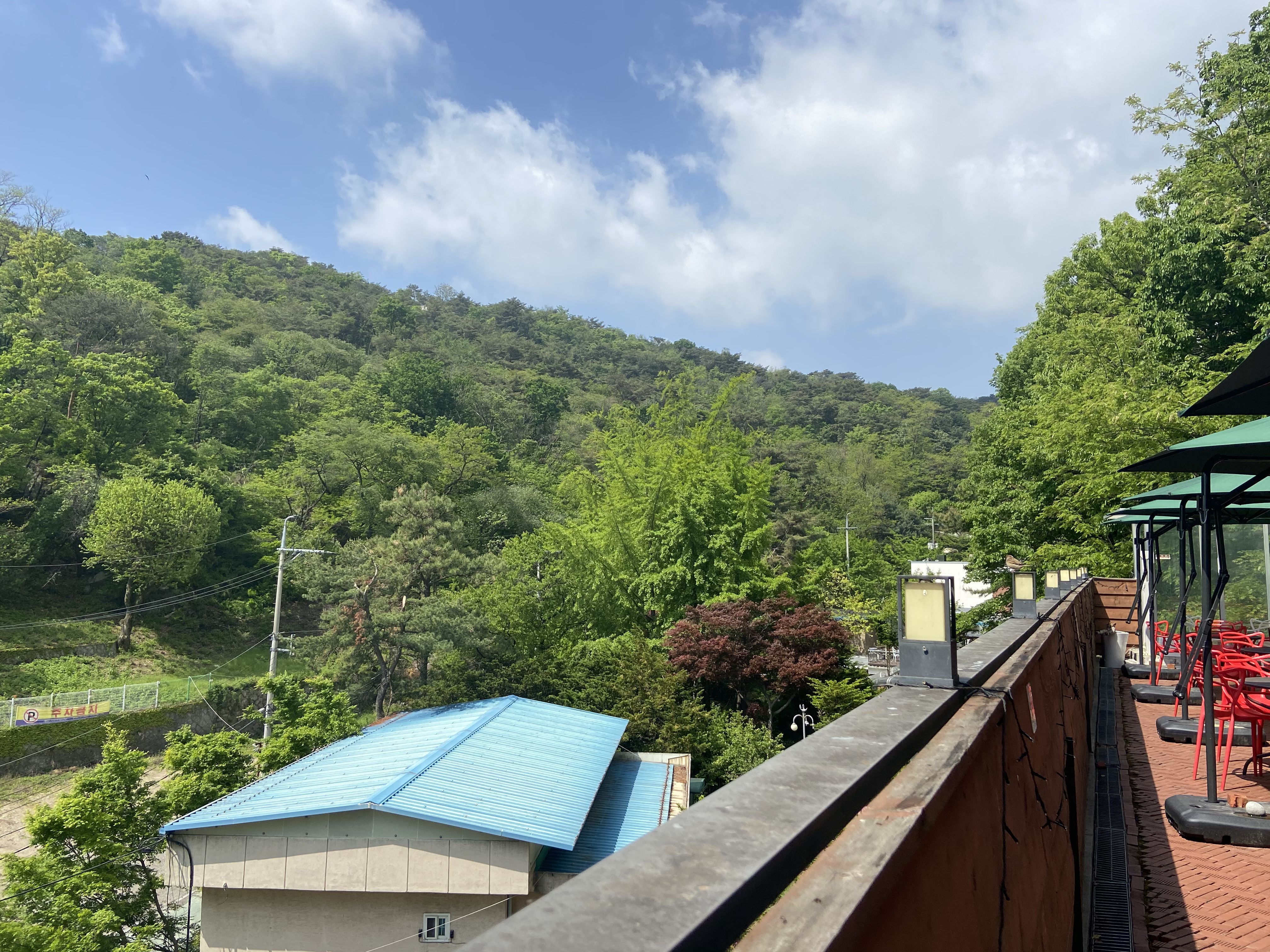 도착해서 야외에서 자리를 잡았어요. 날씨도 좋고 해서 야외에서 먹었어요. 뒤쪽은 이렇게 푸르른 산들이 보이고요. 공기 좋아요.